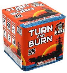 Time to kick the tires and light the fires! Engage the afterburners with 25 shots of TURN & BURN! Multi-color bursts of stars seek and destroy leaving nothing but dust and trails of red and silver lace. Push it to the limit with a 5 shot finale of golden Nishiki willows.